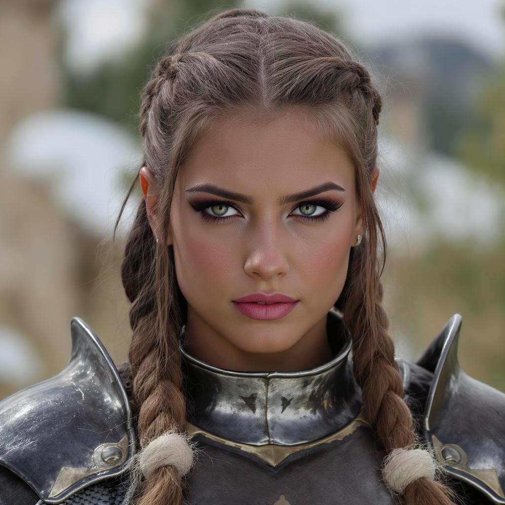 Rising above her armor, you notice the fascinating details of her visage. Her eyes are intense, radiating a strength and resolve that is unmistakable. High cheekbones lend her an air of nobility and elegance. Her hair is meticulously braided, accentuating the contours of her face and underscoring the allure of her features.