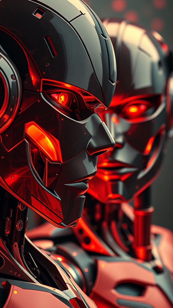 Robot and human figures 2 beta 1 3 3 0, captured in illusory wallpaper portraits style, vibrant realism, featuring modular intense close-ups, rich dark gold and crimson hues, ultra-high-definition imagery, and mosaic-inspired detailed realism, aspect ratio 71:118, maintaining niji 5 spirit with subtle creative twists.