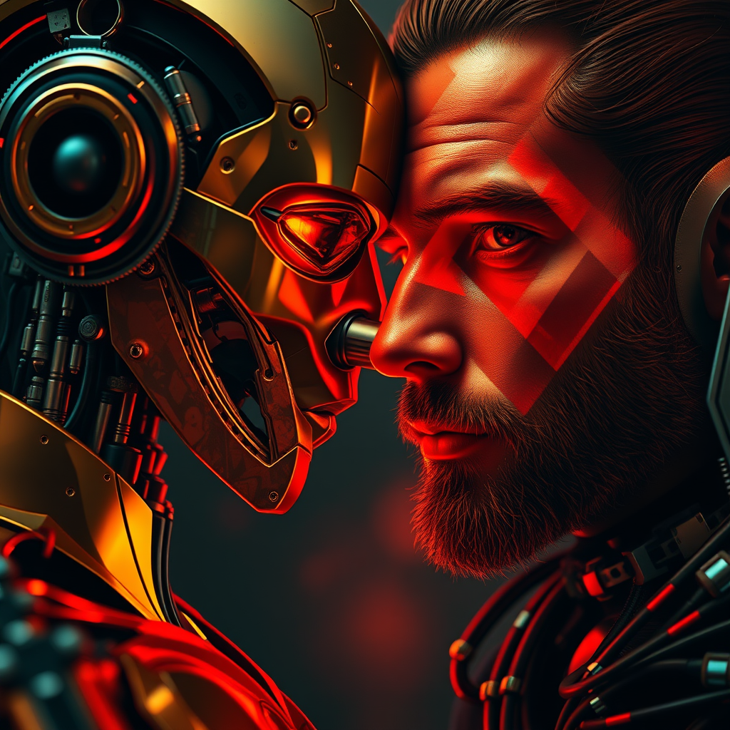 Robot and human figures, vividly intertwined in illusory wallpaper portraits, showcasing colorful realism with modular elements; intense close-ups highlighted by rich hues of dark gold and deep red. Crafted with ultra-high-definition clarity, the image presents a mosaic-inspired realism, capturing fine details and textures. Set in an aspect ratio of 71:118, it evokes a harmonious balance between technology and humanity, with an artistic twist that enhances the core concept.