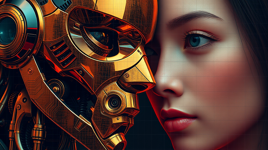 Robot and humans, version 2 beta, with a blend of intense close-ups and mosaic-inspired realism, capturing illusory wallpaper portraits in colorful realism. Features an interplay of dark gold and red tones, creating a modular, ultra-high-definition image that emphasizes intricate details and textures. With an aspect ratio of 71:118 and a stylistic intensity of 750, this artwork embraces a harmonious fusion of technology and humanity, highlighting their coexistence and synergy in a vivid and captivating visual narrative.