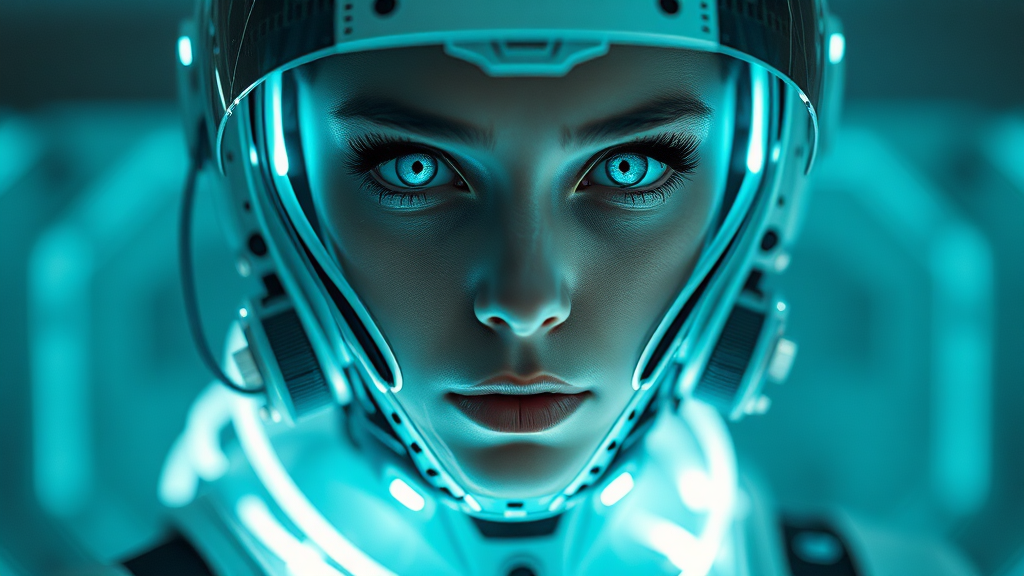 Robot face embodies a fusion of futurism and cyborg aesthetics, featuring a futuristic latex spacesuit interwoven with translucent luminescent tubes and intricate mechanics. Set in both medium and distant perspectives, the focus highlights the elegance of shooting from the thigh to the waist, emphasizing the striking blue eyes. The scene is infused with advanced technologies and hard surfaces, all wrapped in a fashion-forward context. With a sharp focus and high detail, the cinematic imagery exudes a minimalist yet ultra-realistic aura, embracing whiteness as a primary theme. The work is meticulously crafted with cinematic and studio lighting, showcasing sophisticated mechanics and hard surfaces. The render is executed using state-of-the-art techniques in 3D art, like octane render and unreal engine, delivering lighting that supports 8k and 4k glossy resolutions for a hyper-realistic finish.