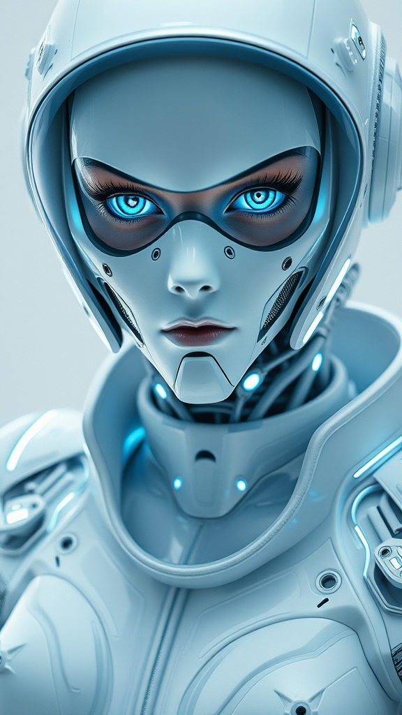 robot facial features showcasing advanced futurism, blending cyborg elements with a sleek futuristic latex space suit adorned with translucent illuminated tubes and intricate mechanical designs, captured with a medium and distant perspective. The composition focuses from the thigh to the waist, highlighting striking blue eyes symbolic of cutting-edge technology. The scene exudes a hard surface aesthetic interwoven with elements of high fashion, captured in razor-sharp focus with cinematic precision. A predominantly white color palette emphasizes minimalistic futurism, achieving an ultra-realistic and photorealistic effect with sophisticated cinematic and studio lighting. Rendered with octane in unreal engine to deliver an 8k, 4k glossy finish while revealing detailed mechanics and a high craftsmanship across the scene.