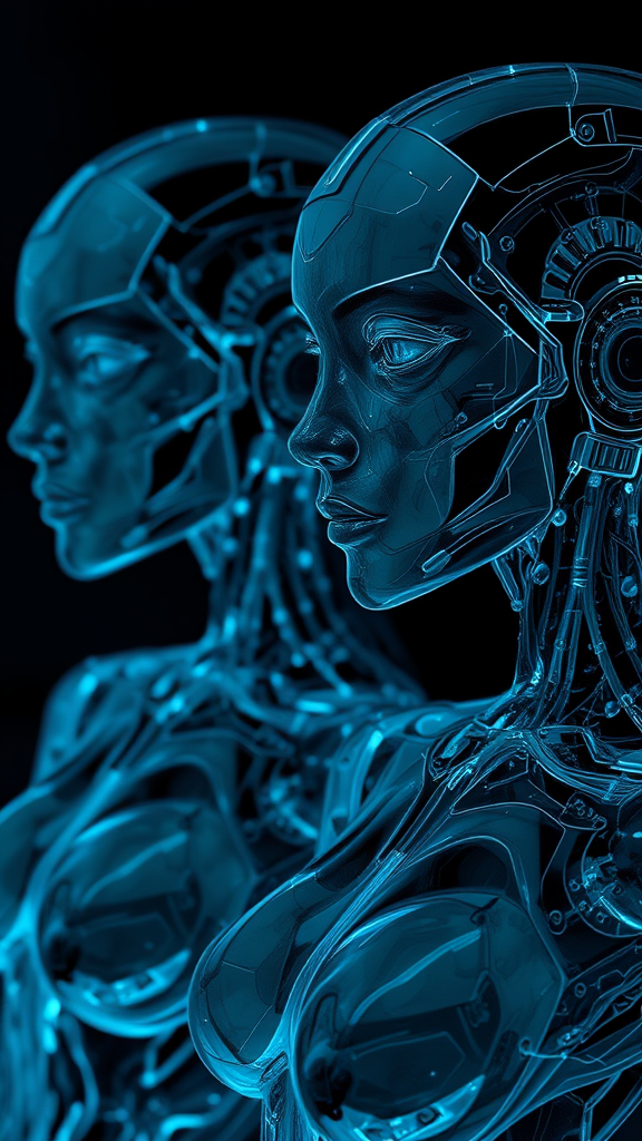 Robot females with intricate anatomical details, set in dark black and azure tones, exhibiting high dynamic range and a fluid, organic design. Captured with the clarity and precision of a National Geographic photograph, showcasing transparent layers and ethereal beauty.