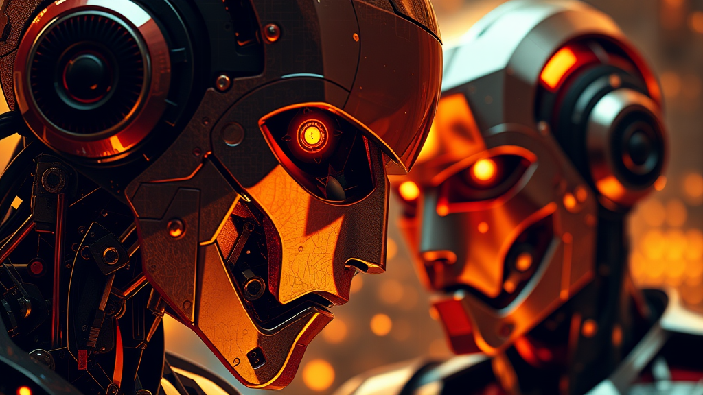 Robot & men synergy, beta 2.0, illusory wallpaper essence, vibrant realism, modular composition, striking close-ups, deep gold and crimson hues, ultra-high definition, mosaic realism-inspired imagery, aspect ratio 71:118, creative depth, surreal integration, intricate detail, tonal fusion, visual harmony, realism meets abstraction.