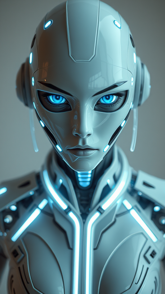 robot visage :: futurism, android, sleek latex space attire with transparent glowing filaments, mechanical elements, Medium perspective, distant perspective, Captured from thigh to waist :: azure eyes :: advanced technologies, rigid structure :: fashion-forward :: sharp focus, intricate details, cinematic quality, vivid imagery :: alabaster hue :: minimalist, futuristic, realism, hyper-realistic, photorealistic, studio illumination, cinematic lighting, engineering, rigid surfaces, octane rendering, exquisitely detailed, rendering, 3d modeling, unreal engine, lighting, 8k resolution, 4k resolution, glossy finish
