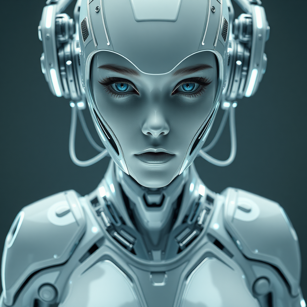 robot visage futurism cyborg sleek latex space attire with translucent glowing conduits mechanical features medium and distant perspectives focus on upper thighs and waist striking blue eyes cutting-edge technology solid surfaces fashion elements crisp clarity high detail film-like quality cinematic aesthetic pristine white minimalism future-centric realism ultra-realistic photorealism cinematic lighting studio illumination mechanical intricacies solid surfaces octane render highly detailed rendering 3d unreal engine advanced lighting 8k 4k glossy surface