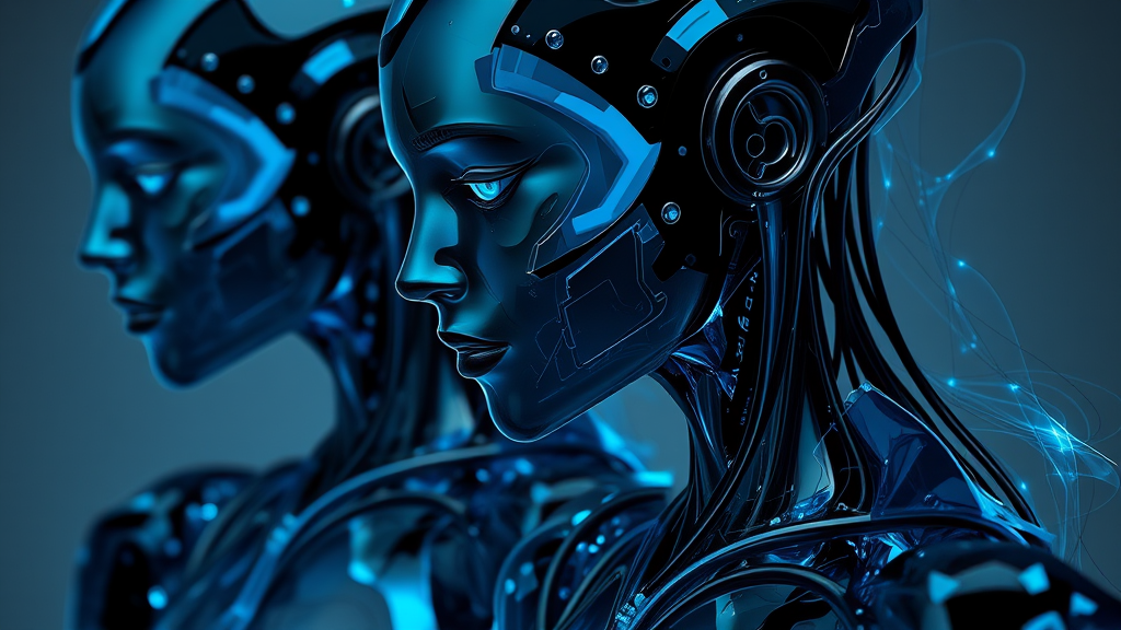 robotic female figures in meticulous anatomical detail, blending dark ebony and vibrant azure hues, exhibiting high dynamic range, with organic, fluid forms, akin to a national geographic photograph, featuring transparent layers, emphasizing depth and complexity