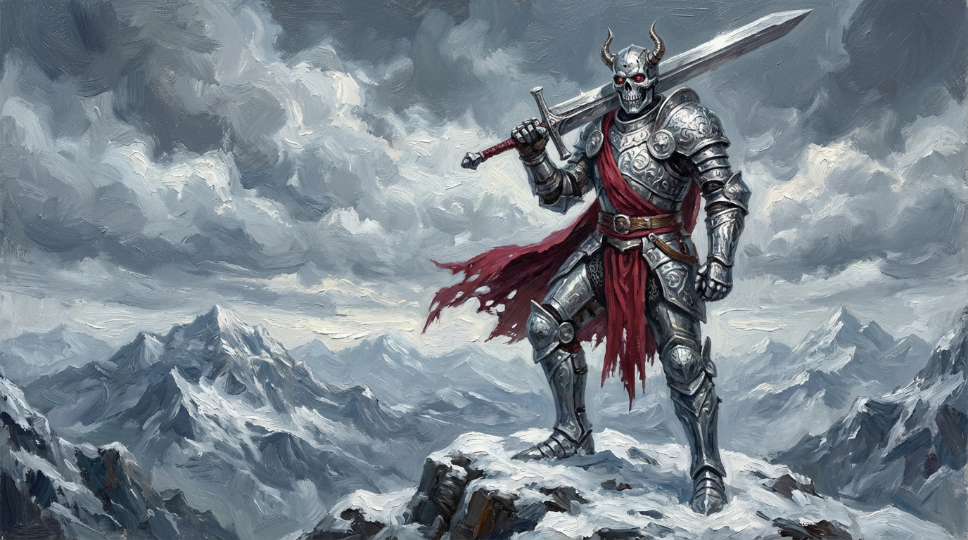 A formidable robotic knight, clad in ornate armor with a tattered red sash, stands heroically on a snow-covered mountain. Its metallic skull head with glowing red eyes and horns adds a menacing fantasy element to the dramatic, cloudy landscape. The artwork features visible brushstrokes, reminisce...