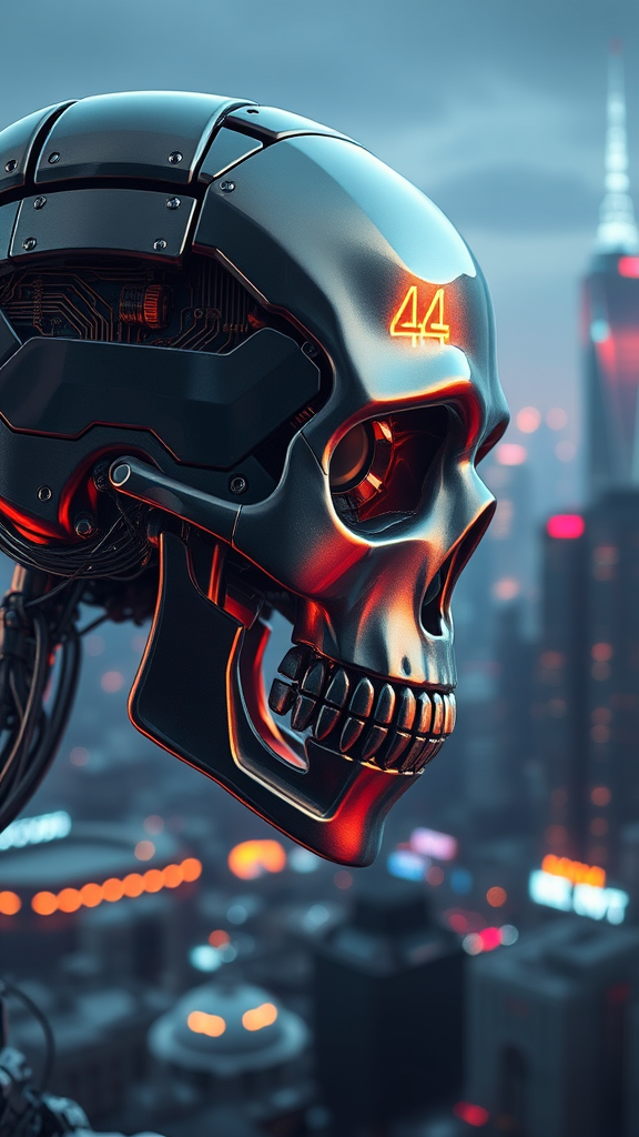 Robotic skull with intricate circuitry details set against a futuristic cyber city backdrop, captured in 8K resolution. The scene is in sharp focus with soft, ambient lighting that highlights the glossy textures of the metallic skull. Neon lights from the city skyline cast colorful reflections on its surface, creating a vibrant yet haunting atmosphere.