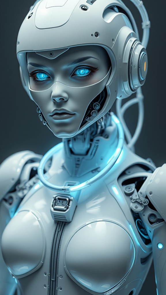 robotic visage futurism cyborg avant-garde latex space suit adorned with translucent glowing tubes intricate mechanics medium perspective distant view focus on upper thighs to waist ethereal blue eyes cutting-edge technology sleek surface futuristic fashion sharp focus intricate detail cinematic realism pristine white aesthetic minimalistic future-inspired design photorealistic cinematic lighting studio setup mechanical elements rigid surface octane rendering highly detailed 3d render enhanced with unreal engine precision dramatic lighting 8k 4k resolution glossy finish