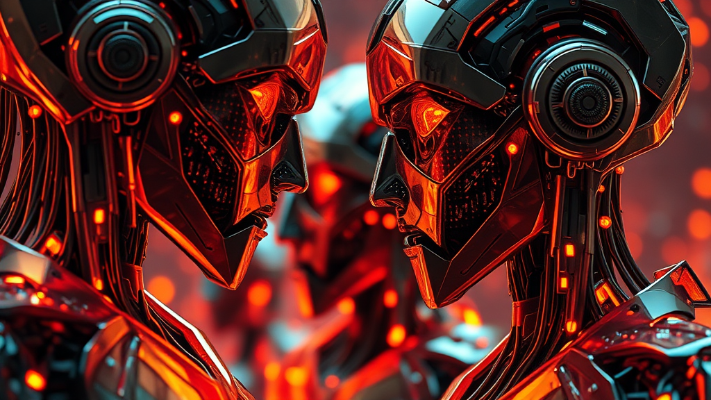 Robots and humans in a vibrant tapestry of beta evolution, showcasing intriguing close-ups in an illusory wallpaper style where colorful realism meets modular design. The scene is imbued with rich hues of dark gold and crimson, creating a captivating mosaic-inspired realism that captures the eye. A UHD image reveals an intense interplay between man and machine, exploring a world of harmony and contrast.