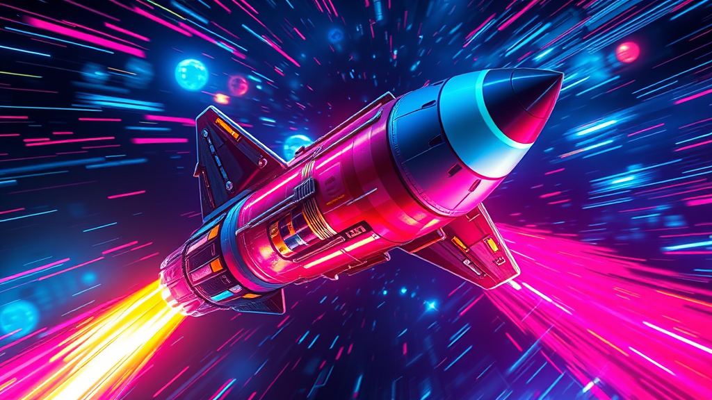 Rocket ship, speed of light, hyperdrive: vibrant neon streams of color woven into an intricate cosmic dance: illuminated with extreme detail and enhanced by cinematic lighting.