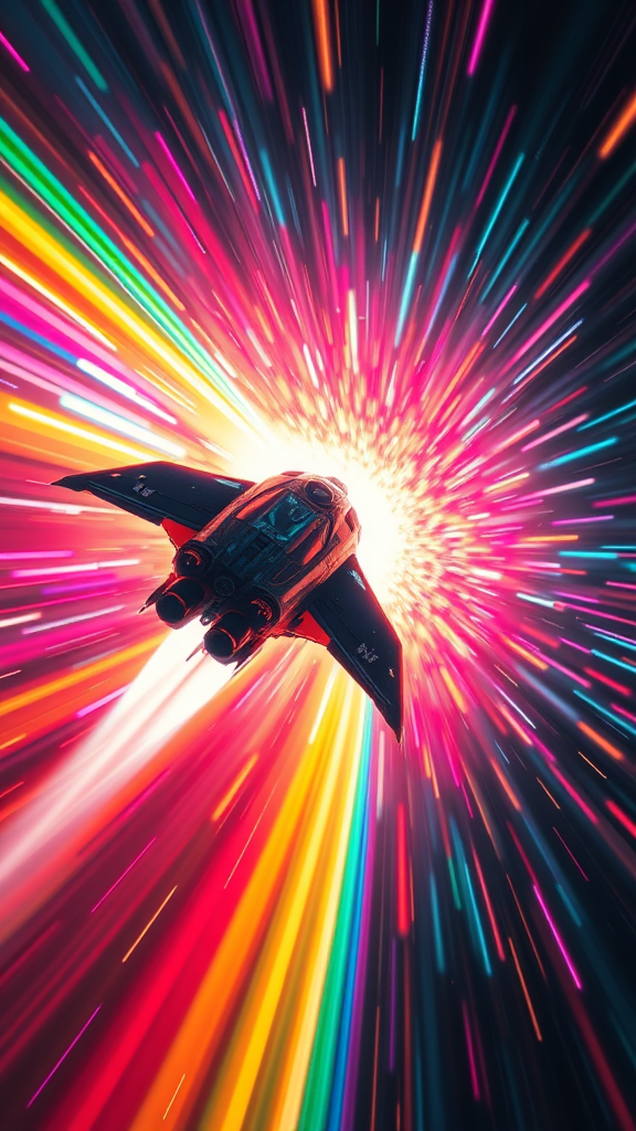 Rocket ship traveling at light speed, powered by hyperdrive, navigating through an explosion of vibrant, neon, and extreme rainbow streams, depicted with illuminated, intricate details under cinematic lighting.
