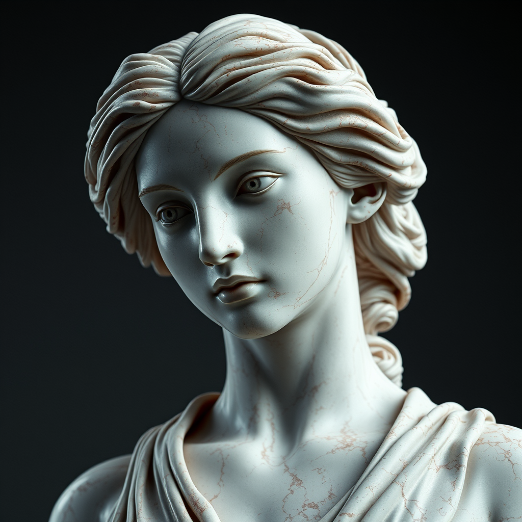 Rojo Bilbao Marble sculpture of a female, high detail, RAW color photo, professional photo, ultra high resolution, highly detailed CG, 8K wallpaper, physics-based rendering, cinematic lighting, photorealistic masterpiece, high contrast, trending on Artstation, 8K HD high definition, hyper-detailed, best quality, ultra high res, sharp, rich colors, dramatic lighting, cinestill 800 film aesthetic, CGI, octane render; realistic portrayal with smooth contours and intricate textures, capturing the essence of marble and the elegance of the female form. Avoid cartoonish features, maintain natural proportions and graceful anatomy, ensuring lifelike details and realistic expressions, while preserving artistic integrity and exceptional craftsmanship.