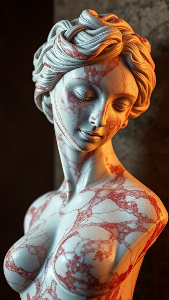 Rojo Bilbao Marble sculpture of a female, high detail RAW color photo, ultra high resolution, highly detailed CG 8K wallpaper, physics-based rendering, cinematic lighting, masterpiece, photorealistic digital art trending on Artstation, high contrast, hyper-detailed, best quality, rich colors, dramatic lighting, photorealistic, ultra high res, detailed, sharp, professional photo, Kodak Portra 400 camera, f1.6 lens, CGI, 3D render, realistic illustration, digital painting.