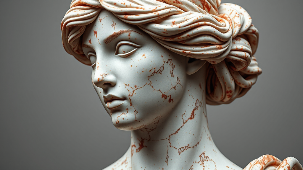 Rojo Bilbao Marble sculpture of a female, high detail, RAW color, professional photo, ultra high resolution, highly detailed, CG unified 8K wallpaper, physics-based rendering, cinematic lighting, photorealistic masterpiece, realistic, photorealism, high contrast, detailed, hyper-detailed, best quality, ultra high res, sharp, d850 film, Kodak Portra 400 camera, f1.6 lens, rich colors, dramatic lighting, elegant composition, sophisticated style, CGI, 3D, seamless render, captivating digital art, exquisite digital painting, nuanced sketch, crafted with precision, lifelike representation, harmonious proportions, intricately designed features, graceful anatomy.