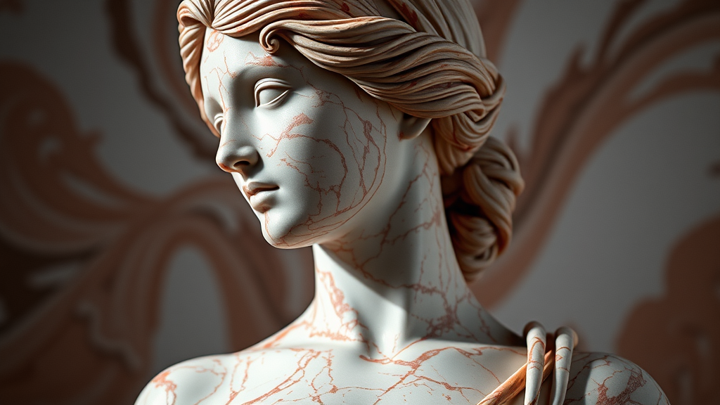 Rojo Bilbao Marble sculpture of a female, high detail RAW color image, ultra high resolution, highly detailed CG 8K wallpapers, physics-based rendering with cinematic lighting, photorealistic digital art, masterpiece of realism trending on Artstation, captured in rich colors and dramatic lighting, shot with a Kodak Portra 400, f1.6 lens for sharp detail. Includes professional render techniques such as CGI, 3D art. The focus is on realism and the beauty of the marble texture, portraying elegance and grace. The piece exudes a sense of artistic depth and refined detail, avoiding poor quality, deformed features, and unrealistic proportions. The artwork is a showcase of high aesthetic value, with no digital artifacts or distracting elements, maintaining the integrity of traditional sculptural artistry.