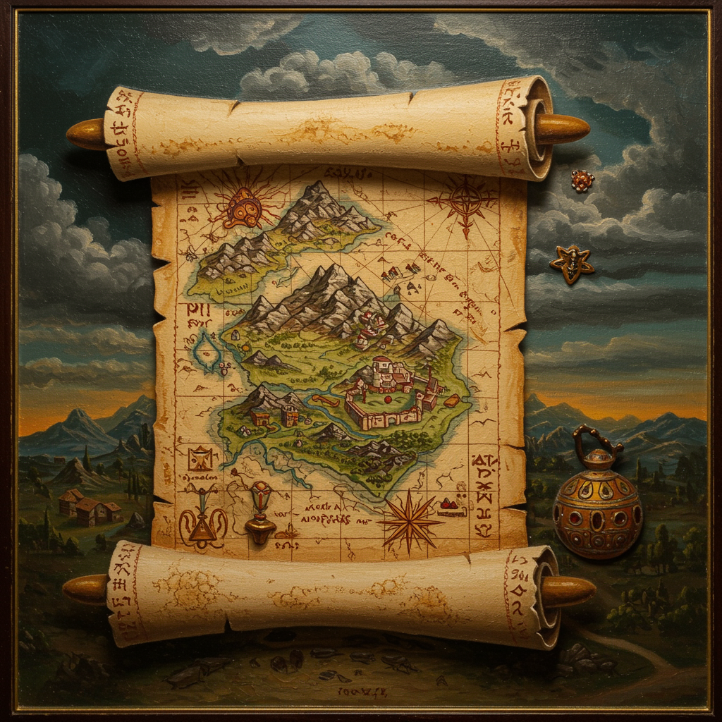 rolled out scroll map 5 raised art pop-up oil painting 3 intricate detail volumetric lighting 2 aspect ratio 3 2