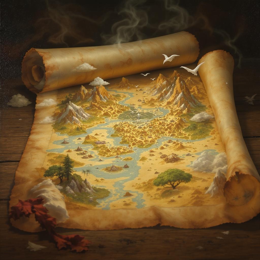 rolled out scroll map with raised art and pop-up elements, textured oil painting style featuring intricate detail and soft volumetric lighting --aspect ratio 3:2