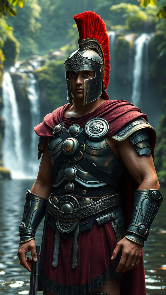 Roman warrior dressed in ornately crafted Spartan armor stands boldly in the lush Amazon River Gorge, dramatic waterfall cascading in the background, captured in 8k ultra-realistic detail. The scene is illuminated with cinematic lighting that enhances every intricate detail of the armor, while reflections shimmer across the water's surface. The photorealistic rendering showcases movie-quality visuals, with state-of-the-art VFX post-production enhancing the vibrant hues of the jungle and the dynamic play of shadow and light. RTX ray tracing adds depth and realism to this striking composition, evoking an epic sense of adventure.