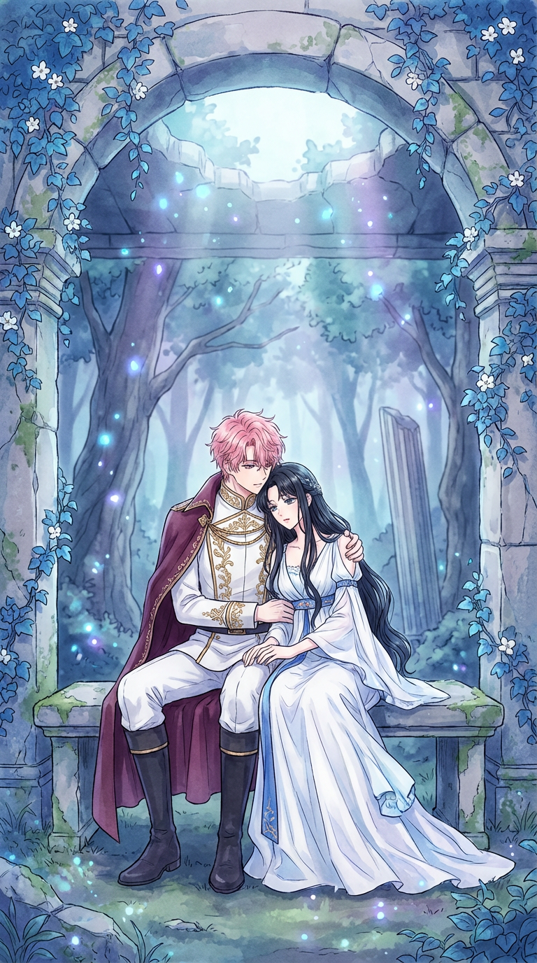 A handsome man with pink hair and a beautiful woman with long black hair sit embraced on a mossy stone bench within an ancient, overgrown arched ruin. Soft, magical lighting and sparkling dust create a dreamy and romantic atmosphere, reminiscent of a fantasy romance novel.