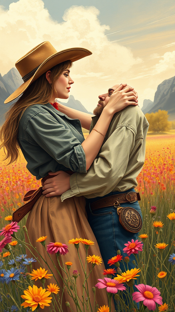Romantic scene illustration of a couple locked in a passionate embrace, set against the rugged charm of the Wild West. The vibrant field of wildflowers sways gently in the breeze, surrounding the lovers with vivid colors. Dusty cowboy hats and worn leather complement the raw, untamed beauty of the landscape, capturing the spirit of a romance novel cover.