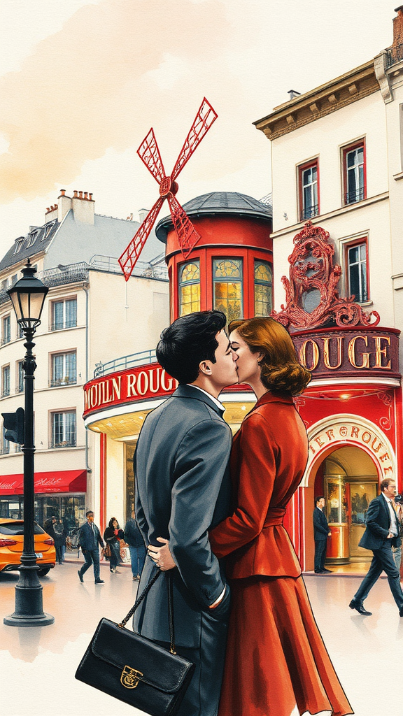 Romantic watercolor paintings of 1950s Paris featuring lovers in front of the iconic Moulin Rouge, capturing the essence of an early evening in autumn. The artwork showcases a skillful composition in the style of Mark League, with an emphasis on a rough texture and subtle pink champagne hues, evoking a sense of nostalgia and charm from the post-war era. The scene is imbued with a captivating ambiance that highlights the warmth and elegance of the era, as the golden light of the setting sun bathes the cityscape, enhancing the allure of this historic and vibrant setting.