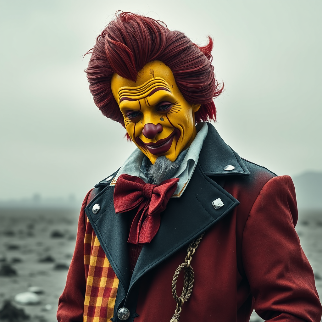 Ronald McDonald, once a vibrant icon, now stands towering over a desolate, grayscale landscape, his signature bright red and yellow hues faded to a dull, almost oil-smeared sheen, as if worn by the relentless passage of time. Eyes sunken, his yellow face paint chipped and cracked, Ronald's gaze lingers with a mix of longing and desperation. A black suit, tattered at the edges, hangs off his broad frame, adorned with intricate, silver studs that reflect what little light seeps into this barren world. A crimson bow tie, once a proud symbol of joy, now speaks of impermanence, it's faded color echoing the dying embers of childhood wonder. His coat, tattered and worn, reveals glimpses of the bustling cities he once witnessed, now a faded memory etched into the fabric itself. A wispy, gray maw of beard frames his face, what was once a jovial smile transformed into a mournful expression. A cinematic light settles whenever he casts a shadow, a poignant testament to the faltering flame of innocence he once represented. In the backdrop, a vast expanse stretches out, weathered streetlights casting long, eerie shadows, painting an atmosphere of melancholy over this majestic figure of decay. Each strand of synthetic hair is meticulously adorned with heavy, falling beads of moisture, each tiny detail capturing light in its glassy reflection, displaying an unsettling contrast between what was once plush, and the revelation of his termination. Eyes that once seared with identified enthusiasm and encouragement for small vacations now degrade dramatically to a dull stare, reinforced with an air of frustration, affirming the dented attraction he peddles. Beneath the unforgiving roof of evening, with faded, toy and balloon strewn remnants strewn around, the stand, with former banners of cheer now mildly sing of departing times. The footfalls that acted as drummer in a beaten tang dance become quiet remembering, disappearing causally into indifference.