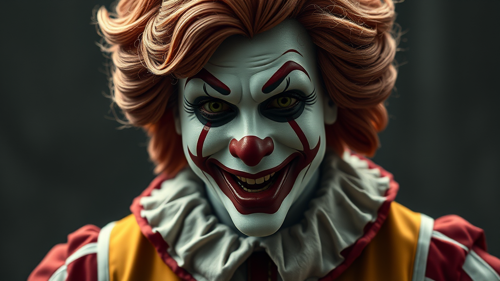 Ronald McDonald reimagined in a goth aesthetic, featuring epic realism and faded, neutral colors; the overall appearance is dramatic with intricate details, imbued with a sense of mystery. His iconic features are transformed into a gothic style, with a focus on cinematic presentation; the detailing is intricate, creating an otherworldly yet recognizable aura around this character.