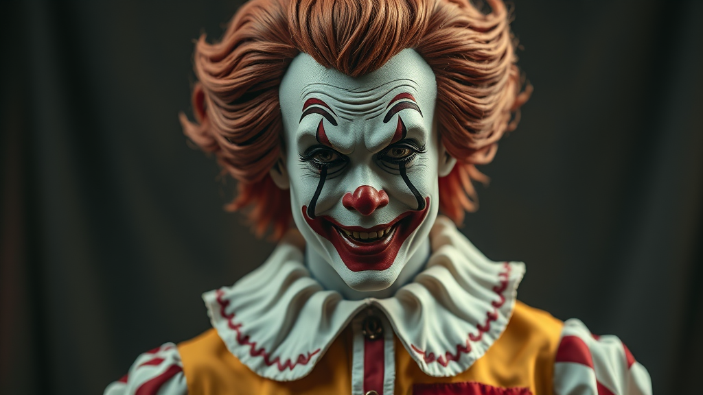 Ronald McDonald reimagined in a goth style, with an epic realistic approach, featuring faded and neutral colors, dramatic and intricately detailed attire, showcasing an intricate, cinematic appearance with elaborate features, capturing the essence of gothic elegance blended with Ronald McDonald's iconic persona.