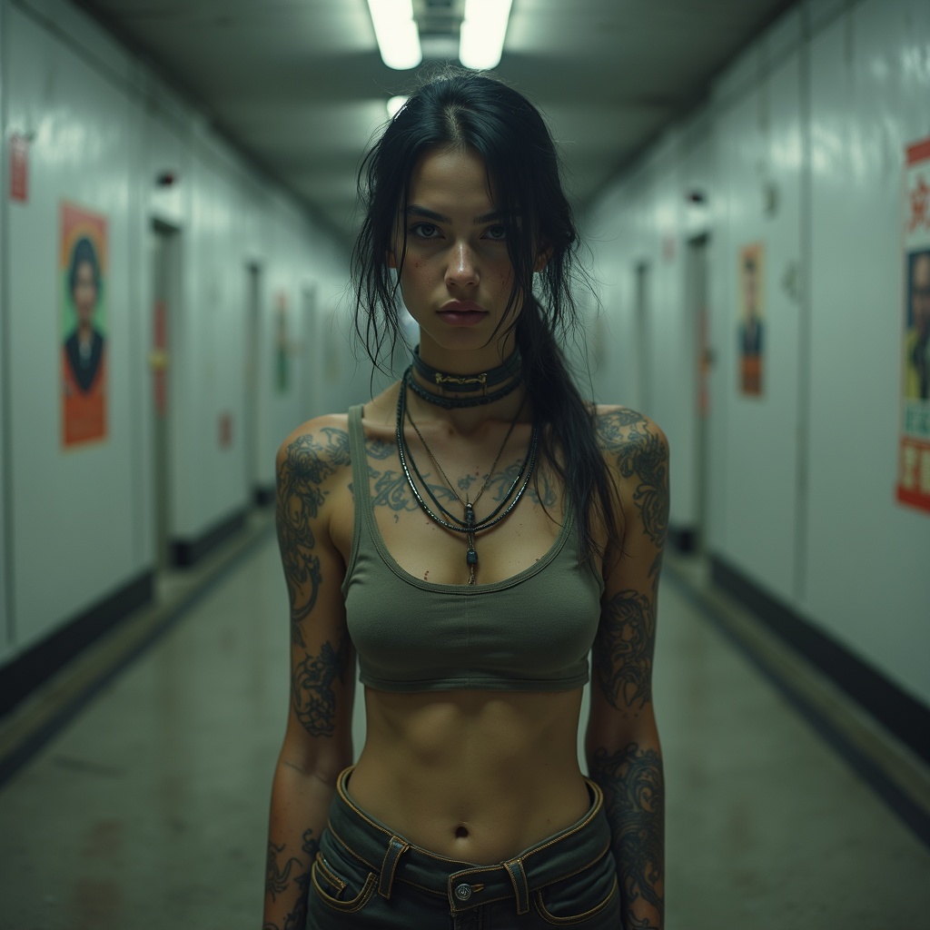 In a stark room within an oppressive government building, where sterile white fluorescent lights leave cold concrete walls in harsh shadows adorned with propaganda, stands a young, slender woman. Her physique is lean, with visible abs and a flat chest. Her skin is marked by dirt, scratches, and intricate tattoos, telling stories of resilience. She dons apparel stitched from recycled materials scavenged from wastelands, embodying a raw blend of survival and ingenuity. Her visage is captured in a hyper-realistic, photo-realistic style, focusing sharply on her presence. The cinematic lighting employs soft diffusion and a shallow depth of field, adding drama to her solitary form against the utilitarian decor. The image is steeped in realism and high detail, presenting a powerful portrait of strength amidst adversity.
