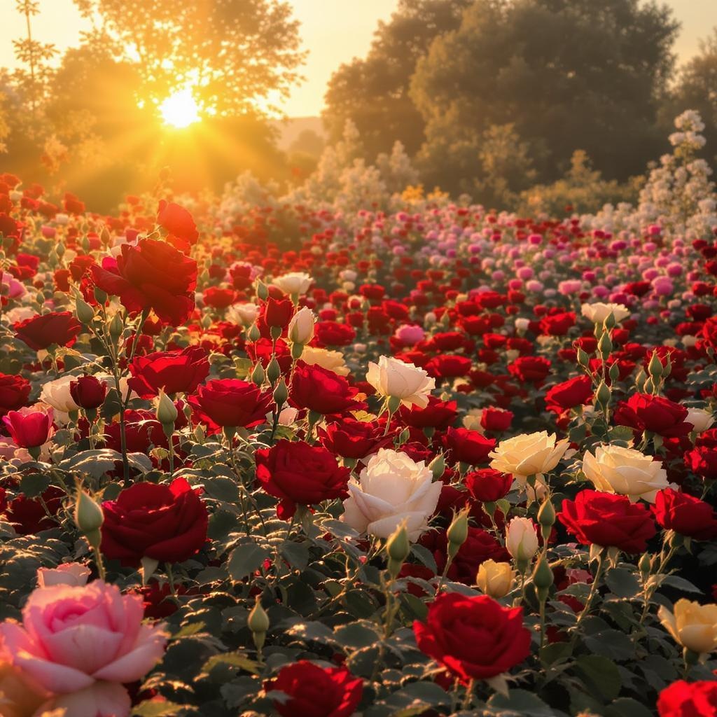Roses at peak blossom with unopened buds amidst a flourishing flower garden, characterized by vibrant hues of red, pink, yellow, and white. Captured in the soft glow of morning light with careful color grading. Taken with a DSLR at 70mm, the shot employs artistic shadow effects, using an aperture of f/22. Presented from a high-angle perspective, this image boasts 8k resolution, offering photorealistic and hyper-detailed visuals with subtle uplighting for dramatic effect.