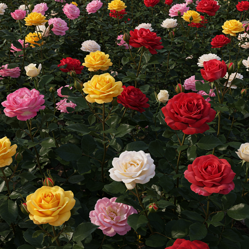 Roses flourishing amidst blooming buds in a vibrant flower garden, showcasing a palette of vivid colors including red, pink, yellow, and white. Bathed in gentle morning light, captured with a DSLR at 70mm, f/22, the composition is enriched with subtle shadow effects and uplighting. Framed from a high angle, the scene is rendered in 8k and boasts hyper-realistic, intricate details, exploring the harmony of nature’s elegance.