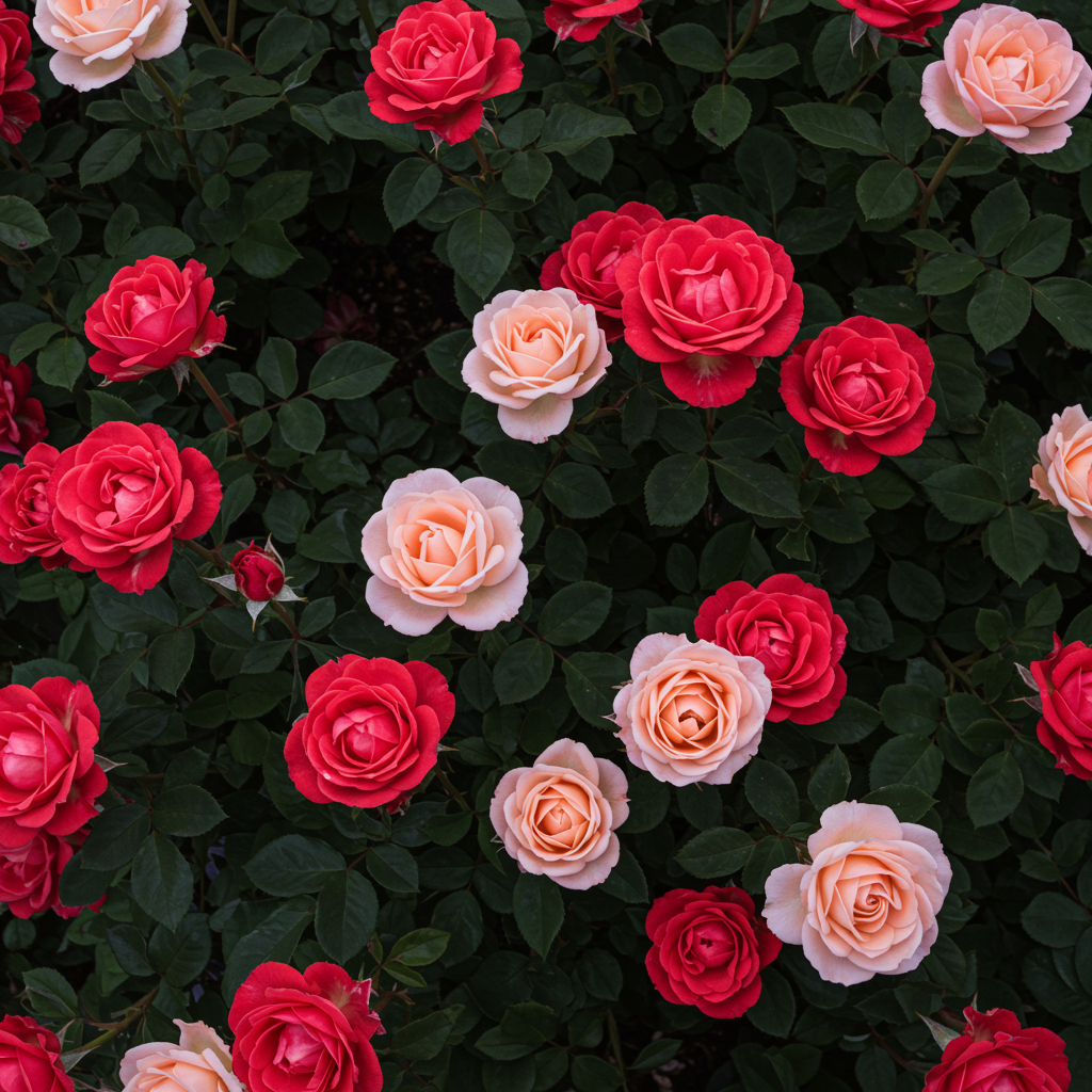Roses flourishing, early blossoms, floral sanctuary, vibrant hues, exquisite gradation, crimson, blush, gold, ivory, dawn sunlight, captured with digital precision, taken with 85mm lens, interplay of light and shadow, f/16 aperture, bird's-eye perspective, ultra-high definition, photo-realism, meticulously detailed, gentle upward illumination, --aspect ratio 9:16 --quality 2 --version 4