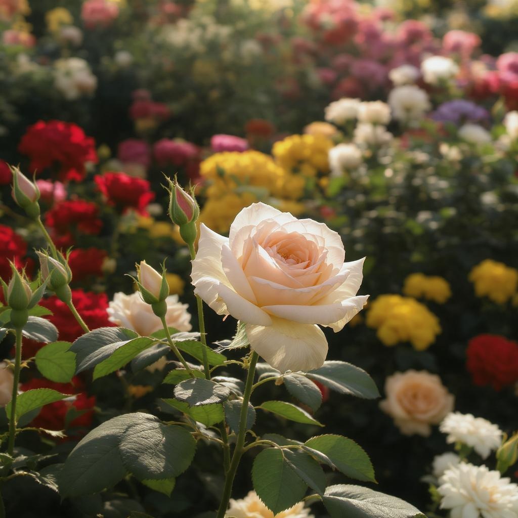 Roses in full bloom with delicate buds, surrounded by a vibrant floral garden showcasing an array of vivid hues including deep reds, soft pinks, bright yellows, and pure whites. Captured in the gentle embrace of morning light, the scene is enhanced by expert color grading. Photographed with a DSLR at 70mm, the image features intricate shadow effects at f/22 from a high angle perspective. The composition is 8k, photorealistic, and hyper-detailed, with subtle uplighting effects for added depth and a cinematic feel.