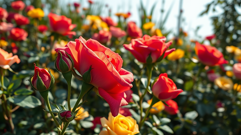 Roses in full bloom with emerging rose buds amidst a vibrant flower garden, showcasing intense shades of red, pink, yellow, and white under the gentle glow of morning light. Captured with a DSLR at 70mm, the scene features intricate shadow effects at f/22 from a high-angle perspective, rendered in 8k with photorealistic and hyper-detailed quality, highlighting unique uplighting—aspect ratio of 9:16 with a touch of creative interpretation.
