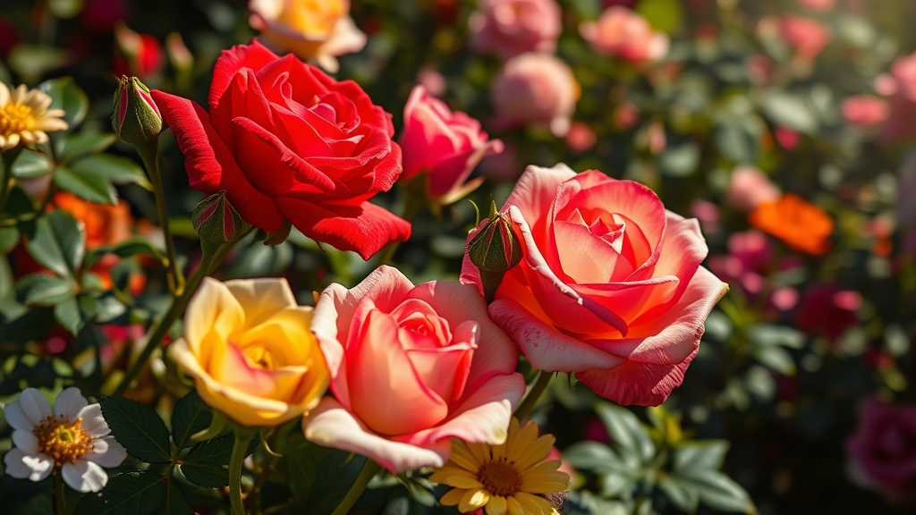 Roses unfurling, delicate rosebuds nestled among vibrant flora, an array of vivid colors captivating the senses, with hues of red, pink, yellow, and white dancing in the morning glow. Captured with a DSLR and a 70mm lens, the scene features intricate shadow play, shot at f/22 from a high angle, showcasing photorealistic, hyper-detailed imagery in 8k resolution. The composition emphasizes an ethereal uplight, accentuating the breathtaking blooms in a tranquil garden setting.