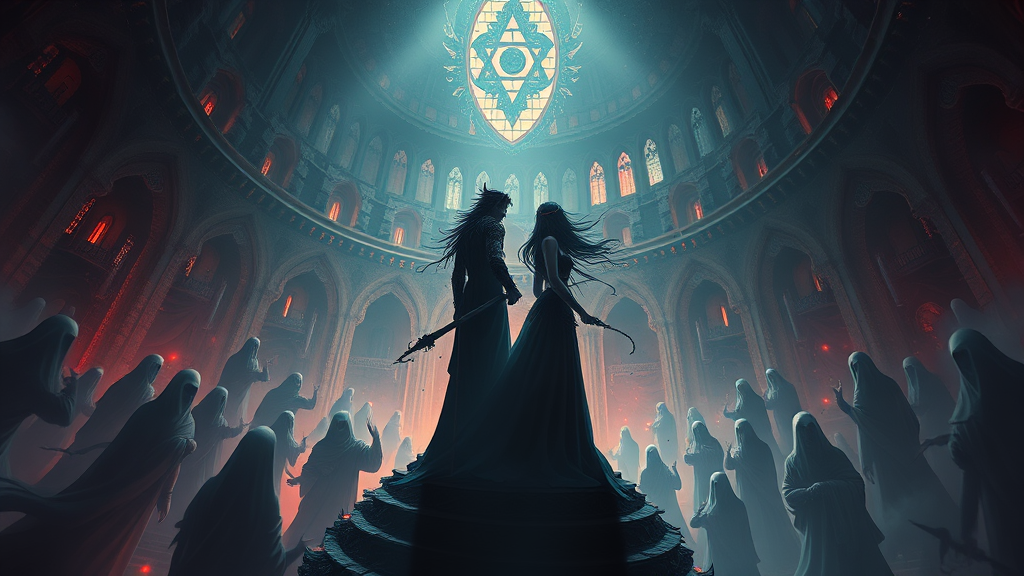 Royal darkness and vibrant contrast merge as two mystical figures stand in a spiral of ghosts within a vast, shadowed castle. Their poses are striking and elegant, reminiscent of grand artworks from Magic the Gathering. The intricate scene is filled with dramatic shadows and tribal dark fantasy elements. Orthodox symbolism weaves through the ambient occlusion, adding layers of emotion and depth to the visual narrative.