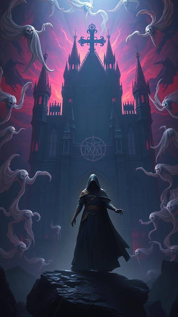 "Royal darkness envelops a majestic Magic the Gathering theme, set against a vibrant contrast of spiraling ghosts within a massive, shadowy castle. A figure strikes a gorgeous pose amidst ominous intricacy, invoking an ArtStation-esque aesthetic with dramatic shadows and orthodox symbolism. The scene is rich with ambient occlusion, evoking deep emotion and a tribal dark fantasy atmosphere."