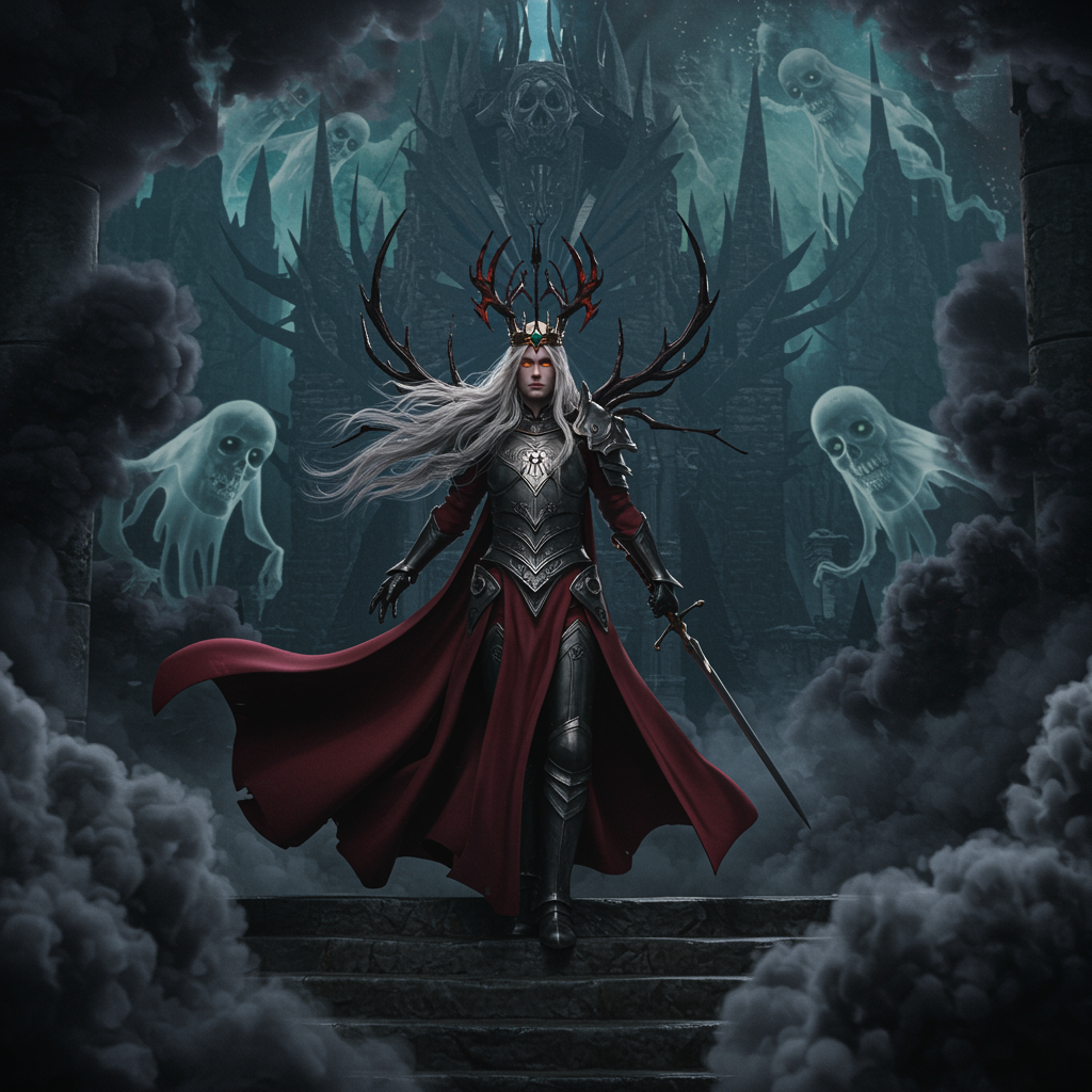 Royal darkness envelops the scene, with long windblown hair and cloth swirling in dramatic fashion. Inspired by the essence of Magic the Gathering, vibrant contrasts dance through clouds of toxic fumes and spirals of smoke, as ghostly apparitions haunt a massive, shadowy castle backdrop. A figure strikes a gorgeous, regal pose, crafted in the style of Massimo Caggese. The atmosphere is ominously intricate, reminiscent of ArtStation's finest works. Dramatic shadows intertwine with orthodox symbolism, creating a rich ambient occlusion effect. The scene is deeply emotional, with dark fantasy tribal elements adding depth. Designed as an ultra-detailed wallpaper, the 3D render is powered by Octane and Unreal Engine, showcasing VFX and cinematic lighting. Displayed in isometric perspective, the masterpiece is brought to life in Blender, offering ultra-realistic detail and 8k resolution—a truly cinematic experience.