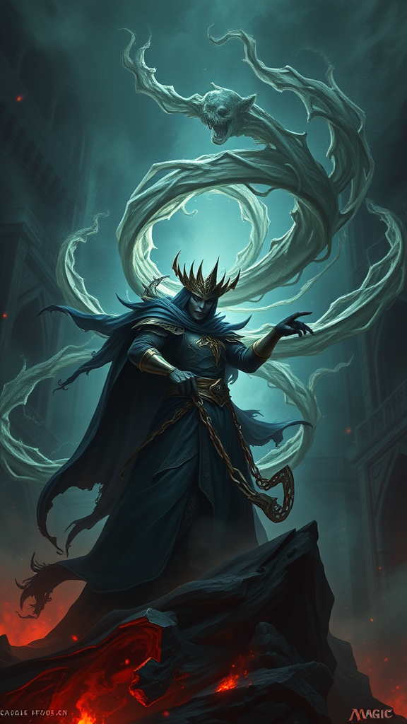 Royal darkness, Magic the Gathering, vibrant contrast, spiraling ghostly forms in a vast dark castle backdrop, majestic pose, ominous intricate details, dramatic shadows, infused with orthodox symbols and ambient occlusion, emotionally charged, tribal dark fantasy elements.