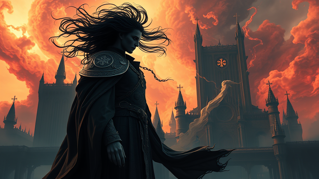 Royal enigmatic figure with windblown hair and flowing garments, set against a Magic the Gathering-inspired backdrop, exuding vibrant contrast amidst swirling clouds of toxic fumes and spirals of ethereal smoke, all within the towering expanse of a grand, dark castle. The figure strikes a stunning pose, reminiscent of the styles of Massimo Caggese, with ominous and intricate detailing. The scene is captured in dramatic shadows, featuring orthodox symbolism infused with ambient occlusion, creating a deeply emotional and tribal dark fantasy atmosphere. Imagined as a detailed 3D render, crafted with Unreal Engine, featuring VFX, cinematic lighting, and an isometric perspective. Realized in Blender, this ultra-realistic 8k cinematic image is designed to captivate with its detailed orthodoxy and tribal motifs, set in a fantastical realm.