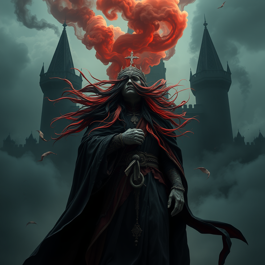Royal figure cloaked in darkness, with long windblown hair and billowing garments resembling Magic the Gathering aesthetics, displaying vibrant contrasts against clouds of toxic fumes. Spirals of ghostly smoke weave through a massive dark castle in the background, the scene composed with a gorgeous pose reminiscent of artworks by Massimo Caggese. The ambiance is ominous yet intricate, showcasing dramatic shadows and orthodox symbolism, creating a rich tribal dark fantasy wallpaper. The environment is designed with ultra-detailed quality, utilizing a 3D render in Octane, powered by Unreal Engine. Cinematic lighting casts an emotional glow in an isometric view, crafted meticulously in Blender to achieve ultra-realism in stunning 8K resolution with cinematic flair.