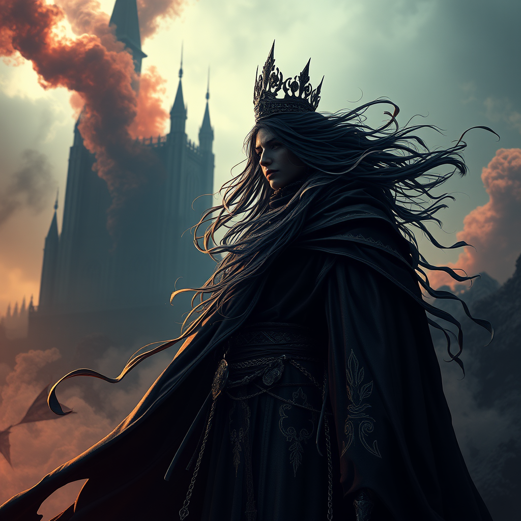 Royal figure cloaked in evocative darkness, their long windblown hair and flowing garments create a striking contrast against the vibrant hues of Magic: The Gathering-inspired realms. Toxic fume clouds and wisps of smoke rise in ghostly spirals, set against the backdrop of a towering, shadowy castle. The subject strikes a mesmerizing pose, captured in an intricate portrait that echoes the detailed artistry of Massimo Caggese. Dramatic shadows intertwine with orthodox symbolism, casting an ambient aura in this tribal dark fantasy scene. Crafted as a high-quality 3D render using Octane and enhanced with Unreal Engine VFX, the piece boasts cinematic lighting and an isometric perspective. Modeled meticulously in Blender, the image achieves ultra-realistic detail in stunning 8k resolution, offering a visually arresting cinematic experience.