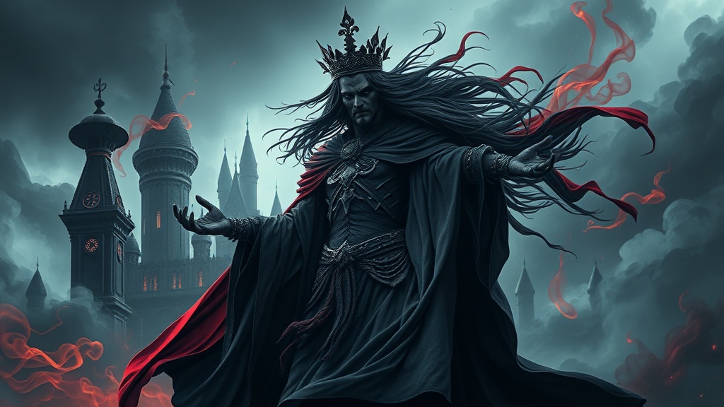 Royal figure in a dark, ominous setting with long, windblown hair and flowing cloth. Inspired by Magic the Gathering, featuring vibrant contrasts and surrounded by toxic fume clouds and spirals of smoke. The backdrop is a colossal, shadowy castle, with the figure striking a captivating pose akin to artwork by Massimo Caggese. The piece embraces ominous intricacies with dramatic shadows, orthodox symbolism, and a tribal dark fantasy ambience. Designed as a wallpaper, it showcases ultra-detailed 3D quality, rendered using Octane and Unreal Engine for cinematic lighting. The scene is isometric, created in Blender, with an ultra-realistic, 8k cinematic finish.
