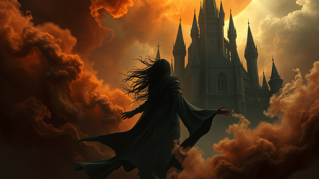 Royal figure enveloped in darkness, adorned with long windblown hair and flowing garments, reminiscent of Magic the Gathering aesthetics. The scene is set against a backdrop of a colossal, shadowy castle. Vibrant contrasts play out amidst swirling clouds of toxic fumes and smoke, forming spirals resembling ghostly apparitions. Bathed in dramatic shadows, the composition bears intricate and ominous qualities akin to the works of Massimo Caggese, with touches of orthodox symbolism. The ambiance is rich with emotional, tribal dark fantasy elements, perfect for a wallpaper. Crafted with ultra-detailed quality in 3D, the piece benefits from the finesse of cinematic lighting, isometric perspective, and was developed using Unreal Engine and Blender. The result is an ultra-realistic 8K render that brings this dynamic, mystical scene to life, with a focus on stunning visual effects and quality akin to a VFX production.