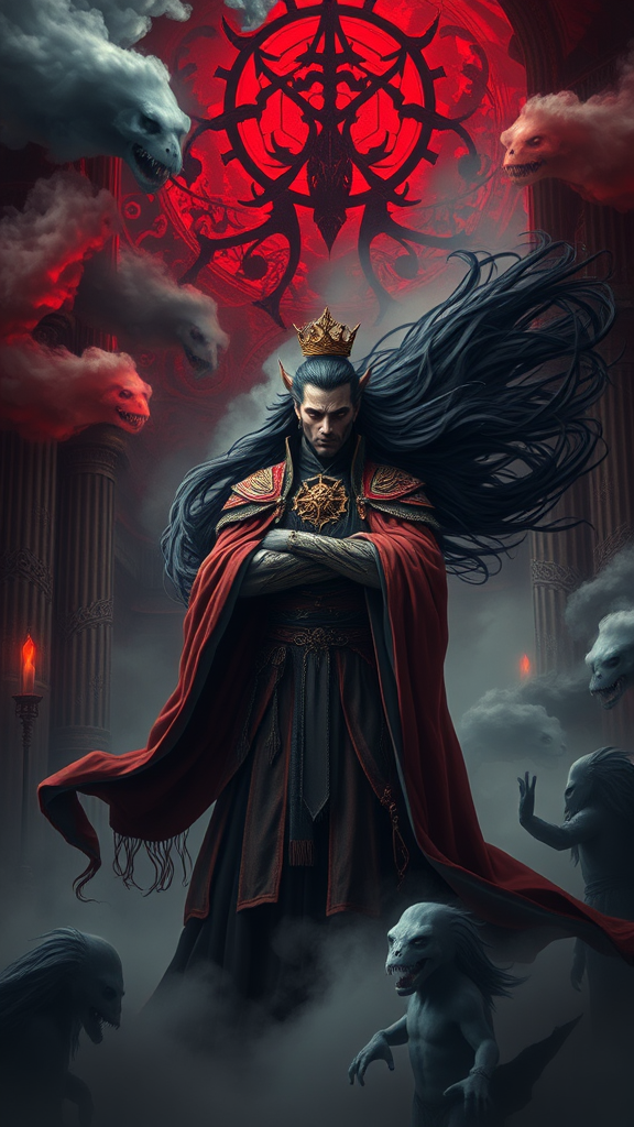 Royal figure with dark, flowing hair and billowing cloth, set against a backdrop evoking the Magic the Gathering universe. The scene is filled with vibrant contrasts, shrouded in clouds of toxic fumes and spirals of smoky ghosts within a vast dark castle. The subject strikes a regal pose amidst dramatic shadows and intricate, ominous details, infused with orthodox symbolism and ambient occlusion. The feel is emotive and steeped in tribal dark fantasy, suitable as a high-quality 8k wallpaper. Created with ultra-detailed 3D rendering, utilizing octane and Unreal Engine for VFX and cinematic lighting. The isometric composition is crafted in Blender, offering ultra-realism and a cinematic experience.