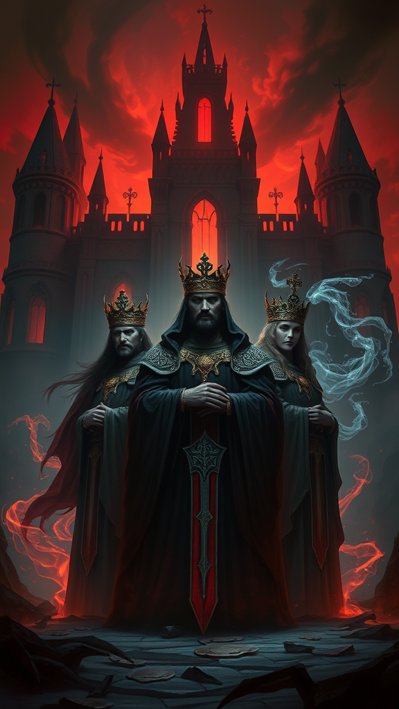 Royal figures bathed in darkness stand against the backdrop of a massive, shadowy castle. Their presence is accentuated by vibrant, contrasting hues spiraling with ethereal ghostly forms. They strike a striking pose, embodying the essence of Magic the Gathering in a portrait style. Mysterious and intricate, the scene is infused with dramatic shadows and rich orthodox symbolism. The ambient atmosphere is layered with emotional depth and tribal dark fantasy elements, enhanced by ambient occlusion techniques that bring out the textured details.