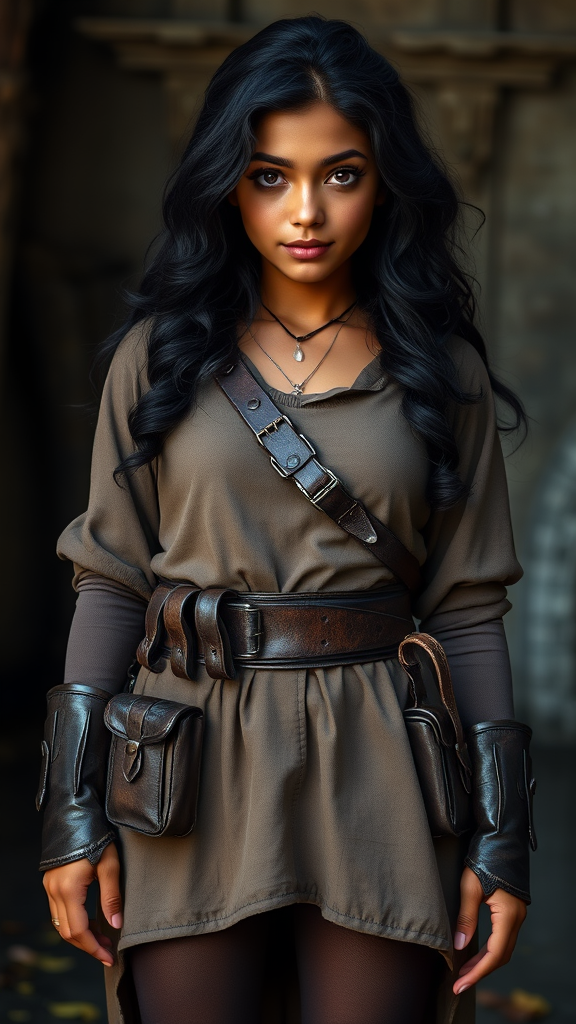 RPG fantasy portrait of a charming young female adventurer with wavy black hair, a dark tan complexion, and big expressive brown eyes, exuding friendliness and intelligence. She wears a thick leather belt with numerous pouches, standing confidently in a long, loose fantasy tunic and cloth tights, complemented by leather armor. Her wide hips add to her distinctive silhouette. The setting captures the essence of the fantasy genre in UHD, HDR, 8K quality. Avoid elements like duplicate features, disfigurement, or low-resolution artifacts to maintain a pristine and immersive visual.