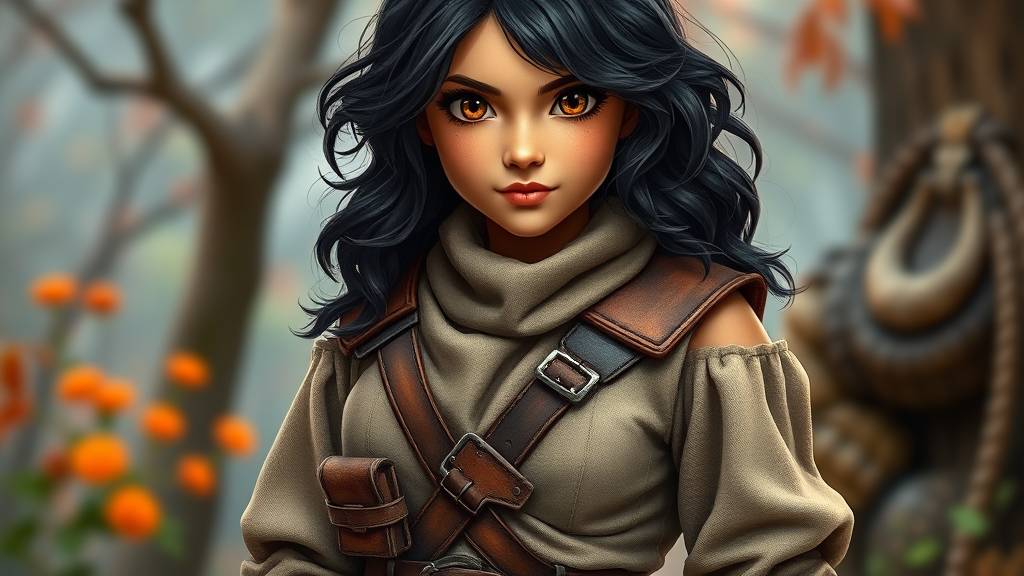 RPG fantasy portrait of a charming young female adventurer with wavy black hair and a warm tan complexion, featuring large expressive brown eyes that exude friendliness and intelligence. She is adorned in a thick leather belt equipped with numerous pouches, standing with confidence in a long, flowing fantasy tunic paired with cloth tights. Her attire is complemented by sturdy leather armor, accentuating her wide hips. This image is set in a vibrant fantasy setting, envisioned in ultra-high definition with rich detailing. Include subtle elements like a hint of magical energy around her, suggesting a mystical aura. Avoid modern elements or distortion and maintain a clear and engaging composition without modern clothing, duplication, or any form of disfigurement. Ensure there are no digital artifacts, text, or branding within the image, keeping the focus on the natural and fantastical essence.
